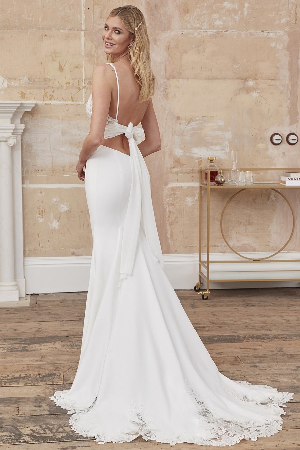 Deze elegante trouwjurk 11196 van Adore by Justin Alexander combineert een fijn bewerkte kanten bovenlijf met een strakke, vloeiende rok.